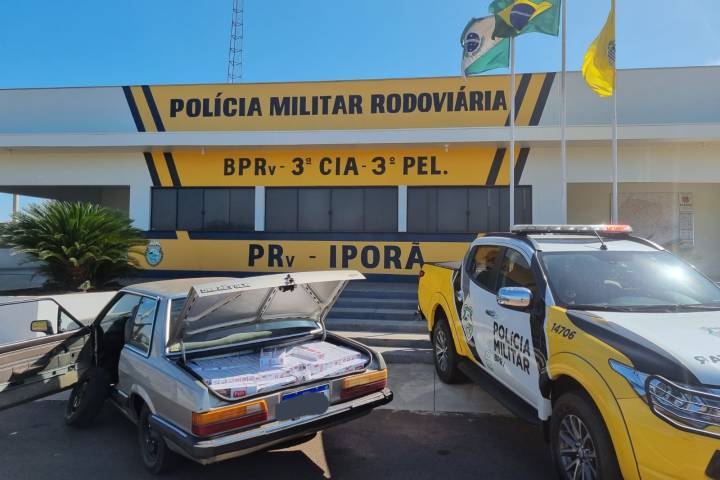 Um condutor de 43 anos e outro passageiro de 41 anos foram presos nesta segunda-feira (4), após serem flagrados transportando 10 caixas de cigarros da marca Eight – de origem paraguaia – que totalizam cerca de 500 pacotes no porta-malas de um automóvel Del Rey, na rodovia PR-486, no município de Alto Piquiri.