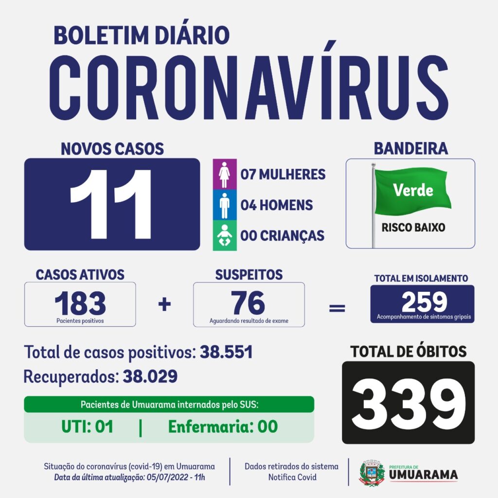 Um homem de Umuarama está internado na UTI do hospital Uopeccan – ele tem 63 anos e tomou quatro doses da vacina. O número de casos suspeitos é de 76 e total de casos ativos é de 259, indicando que 259 pessoas estão em isolamento domiciliar.