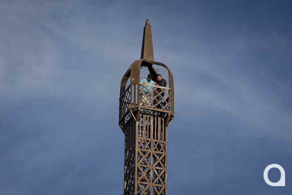 A torre da Estância Paris, nome que deu ao condomínio, levou um ano para ficar pronta. Com 30 toneladas de ferro e fibra de vidro e na cor ouro envelhecido, tem 32 metros de altura [o equivalente a um prédio de onze andares] e 12 de largura na base [suficiente para a passagem de um caminhão entre os quatro pés].