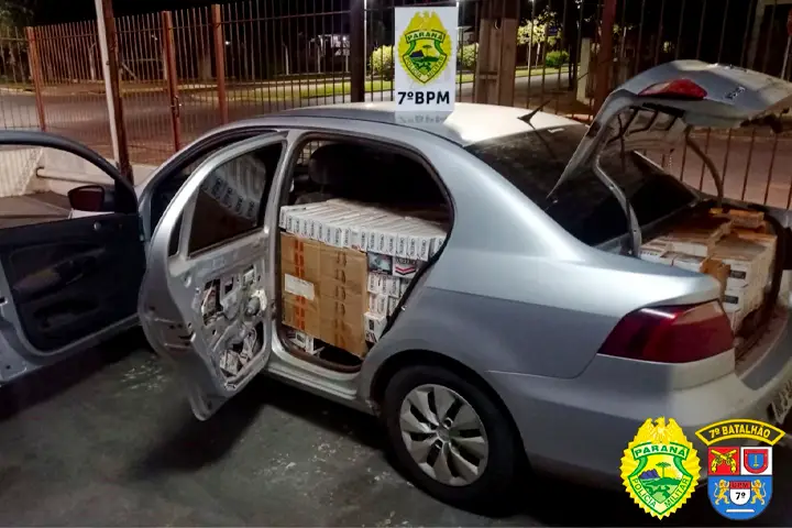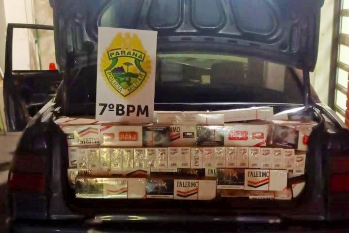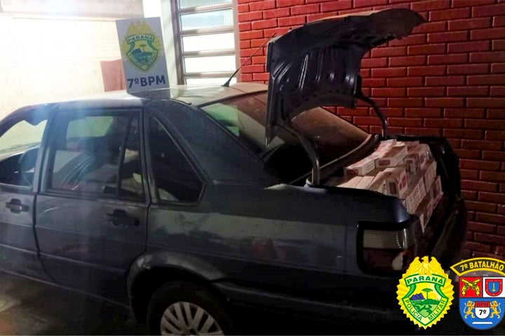 No carro, foi encontrado aproximadamente 20 caixas de cigarros contrabandeados além de um rádio comunicador.