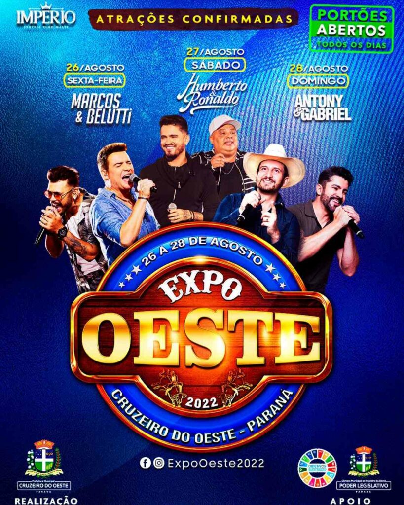 A Expo Oeste terá portões abertos todos os dias. No dia 26 a atração será a dupla Marcos e Belutti. No dia 27 o show será com Humberto e Ronaldo e, para fechar a programação artística, no dia 28 a animação fica a cargo de Antony e Gabriel.