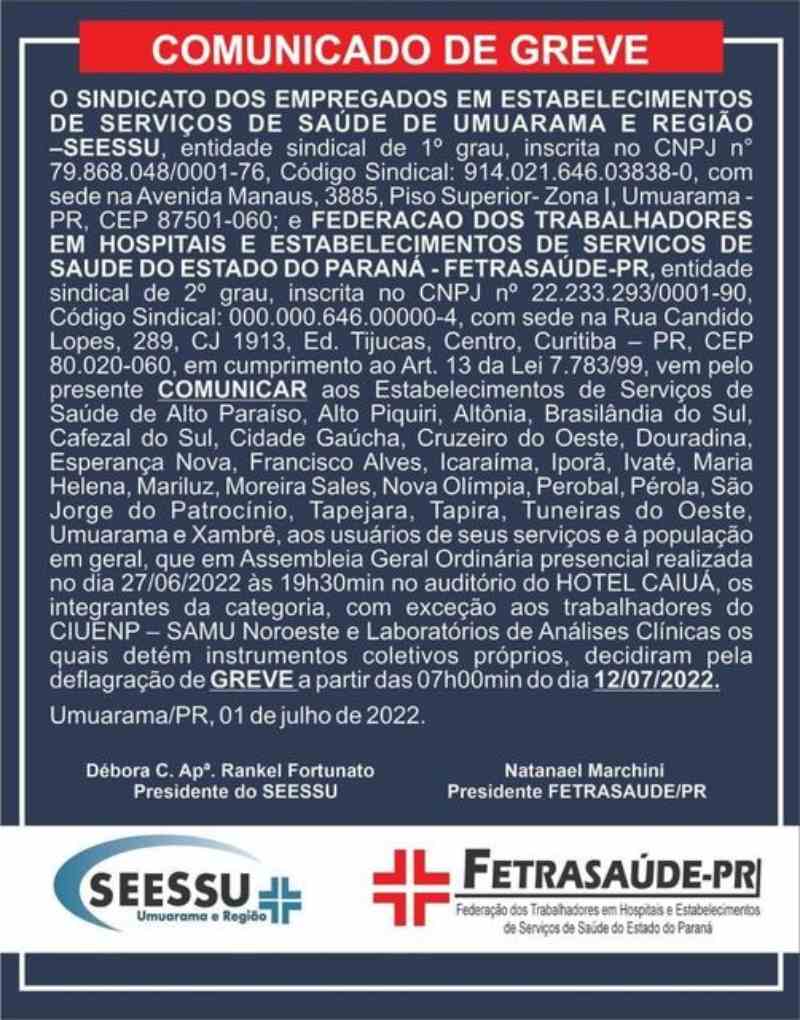 O Sindicato dos Empregados em Estabelecimentos de Serviços de Saúde de Umuarama e Região (Seessu) divulgou nesta semana um comunicado de greve para informar a categoria e a população sobre a medida que deve ser adotada a partir do dia 12 (próxima terça-feira). A paralisação de parte dos trabalhadores da saúde está relacionada com a falta de um acordo nas negociações salariais.