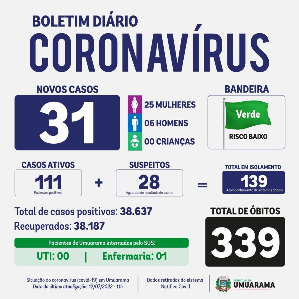 E de acordo com o Boletim Covid desta terça-feira (12) 31 novos casos foram confirmados, sendo 25 mulheres e seis homens, sem nenhum caso da doença em criança registrado desde 30 de junho.