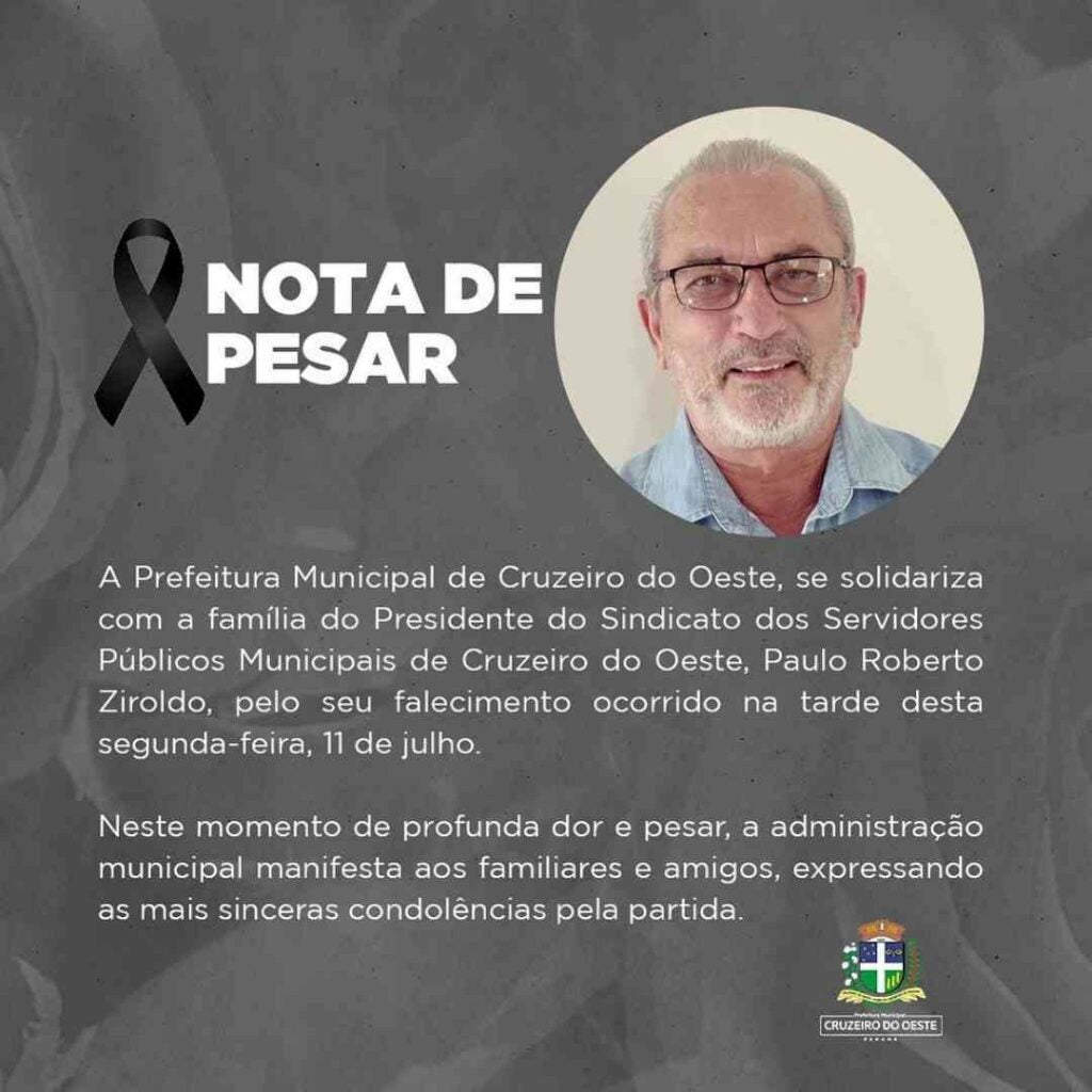 “A Prefeitura Municipal de Cruzeiro do Oeste, se solidariza com a família do Presidente do Sindicato dos Servidores Públicos Municipais de Cruzeiro do Oeste, Paulo Roberto Ziroldo, pelo seu falecimento ocorrido na tarde desta segunda-feira, 11 de julho.