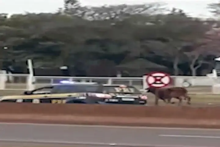 No vídeo – enviado ao portal CGN por um internauta – é possível ver que o animal corre descontrolado pela via, enquanto é perseguido por uma viatura da PRF.