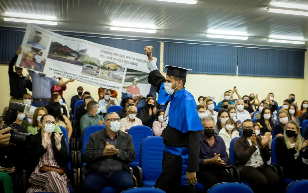 Por sinal, era a única faixa no local, que recebeu dezenas de familiares e amigos para acompanhar, numa noite de temperatura agradável, na casa dos 20 graus, a colação de grau em Cidade Gaúcha.