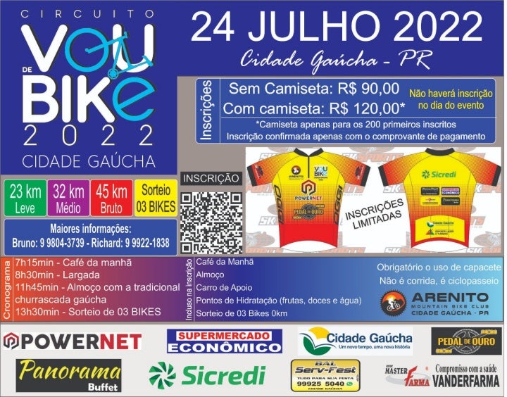 Cidade Gaúcha terá uma etapa do Circuito Vou de Bike neste domingo (24) e ainda é possível fazer as inscrições. O evento é uma realização do Arenito Mountain Bike Club de Cidade Gaúcha, em parceria com a Prefeitura Municipal e patrocinadores.