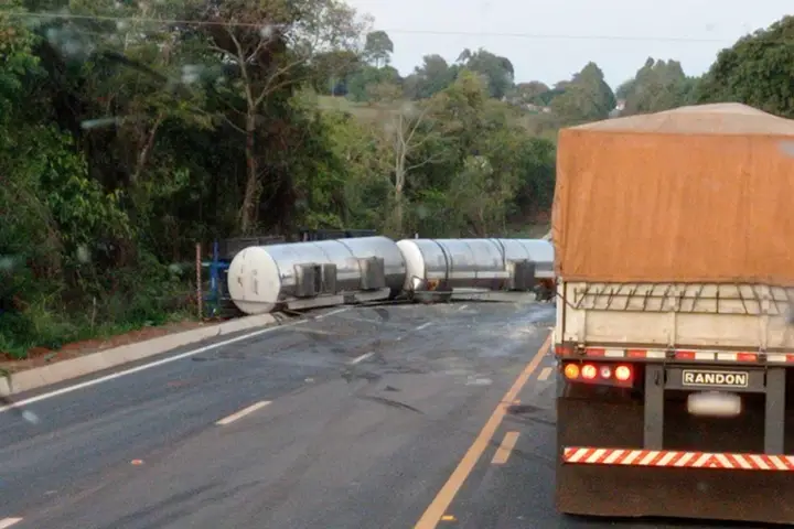 Com o tombamento, o veículo acabou vazando leite pela rodovia, que está parcialmente tomada pelos dois tanques.