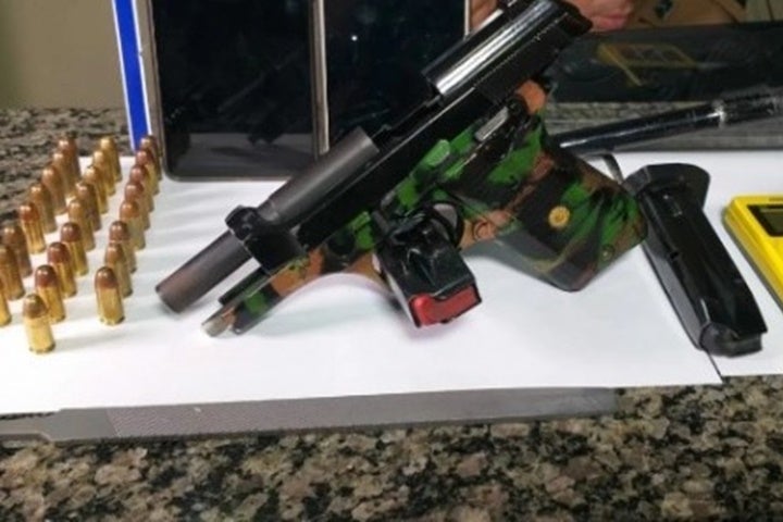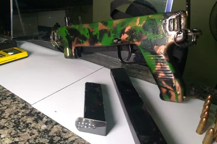 Em uma busca pela residência do acusado, os policiais também encontraram uma submetralhadora municiada e uma pistola calibre .380 que estavam embaixo do banco de um automóvel estacionado.