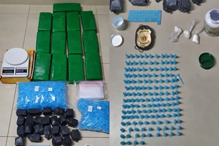 A apreensão consistiu em 13 tabletes de maconha, totalizando 10,4 kg; 23 porções de maconha já divididas para venda, totalizando 1,1 kg; 157 pinos de cocaína, totalizando 117 gramas; 3 porções maiores de cocaína, totalizando 13 gramas; 45 comprimidos de ecstasy; 1500 unidades de pinos plástico para preparo; 1 pacote de embalagens plásticas; 01 balança de precisão; e 1 faca para fracionamento das drogas.