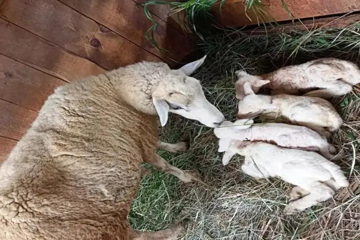 Esta é a terceira cria da ovelha, da raça francesa d’Ile. Na primeira cria o animal deu a luz a somente um filhote. Na segunda cria veio a ninhada de três carneirinhos, e agora – para a surpresa dos criadores – os quatro filhotes.