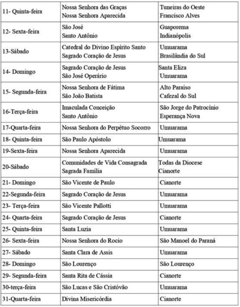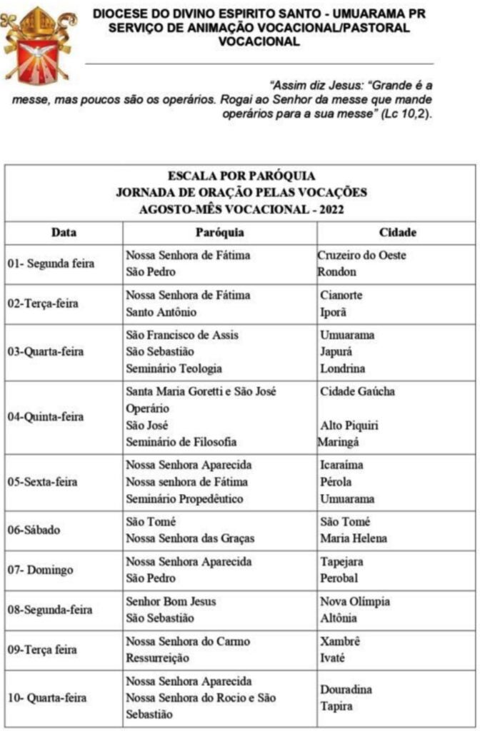 Em decorrência do Mês Vocacional, o SAV (Serviço de Animação Vocacional) junto à Diocese de Umuarama, realizará a 1ª Jornada Regional de Oração pelas Vocações. O evento acontecerá durante todo o mês de agosto, em todas as paróquias da Diocese.