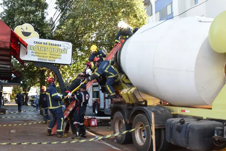 Na sequência, ele subiu na parte do tanque do veículo e acabou com a perna presa na betoneira, que estava em funcionamento com uma equipe de trabalhadores que realizavam um trabalho de construção no local.