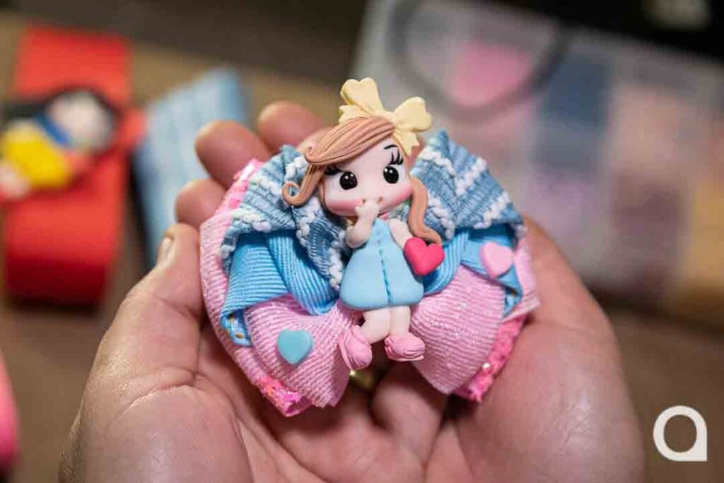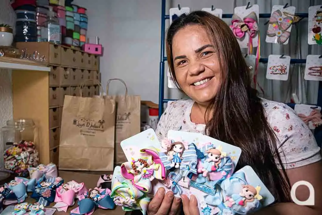“Eu colocava na cabecinha da Júlia para passear e muitas mães, quando viam, elogiavam e perguntavam onde eu tinha comprado; ao responder que eu fiz, vinha outra pergunta: ‘se eu fazia para vender’. Assim, percebi que teria clientela se investisse na ideia”, conta Ana Paula, mostrando seu espaço de trabalho, um quartinho nos fundos da casa.
