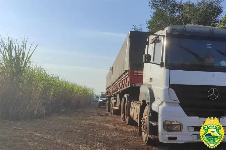 O caminhão bitrem Mercedes Benz axor 2544 e o semi-reboque foram flagrados às margens da estrada rural. Na abordagem, os policiais consultaram o sistema e constataram divergência nas características do emplacamento.