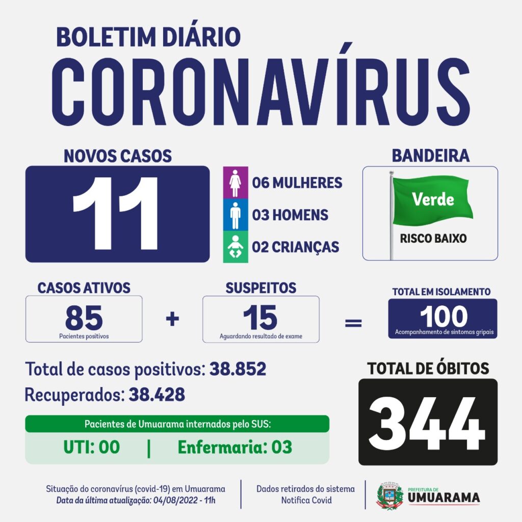 O Boletim Covid desta quinta-feira (4) traz a informação de que mais 11 casos foram confirmados, sendo seis mulheres, três homens e duas crianças (uma de quatro anos, que ainda não foi vacinada, e outra de 10 anos, que já tomou a primeira dose do imunizante).