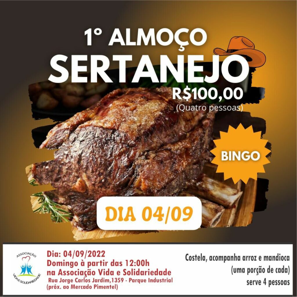 1° ALMOÇO SERTANEJO – ASSOCIAÇÃO VIDA E SOLIDARIEDADE DO PARQUE INDUSTRIAL – DONA MARIA DA SOPA – Data: 04/09/2022 – domingo – Horário: a partir das 12h – Local: Rua Jorge Carlos Jardim s/nº – Parque Industrial I – Contato: (44) 3639-3688.
