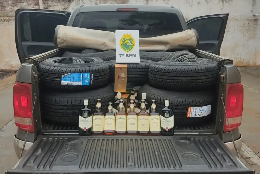 Uma caminhonete carregada com pneus e bebidas contrabandeadas do Paraguai foi apreendida na PR-323, em Tapejara, na tarde desta terça-feira (9). A apreensão foi pela Polícia Militar (PM) do 7º Batalhão.