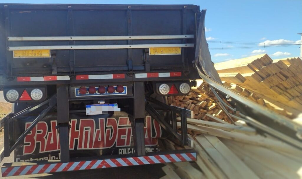 Madeiras deslizam da carroceria de caminhão e obstruem trevo em rodovia