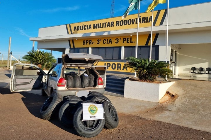 Ao abordar o automóvel, os policiais constataram que o condutor e o passageiro – ambos Paraguaios – estavam carregando 75 pneus de origem estrangeira dentro do veículo.