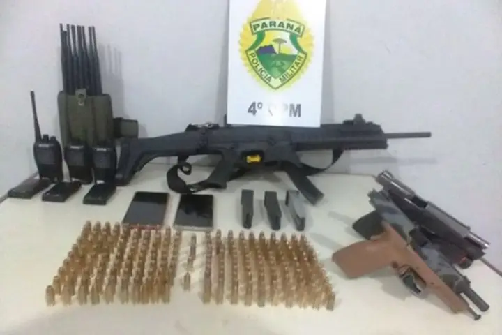 Além do carro, que constava com alerta de furto em Londrina, a polícia conseguiu apreender uma submetralhadora calibre 9 mm, duas pistolas equipadas com kit rajada, munições, capuzes, rádio comunicadores, e equipamento bloqueador de sinais para automóveis.