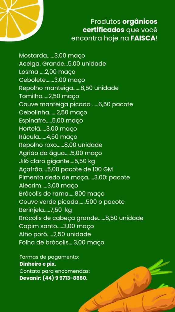 A Feira Agroecológica de Inclusão Social Cultura e Artes de Umuarama, a Faisca, terá mais uma edição na tarde deste sábado (13). A partir das 16h estarão à venda diversos produtos.
