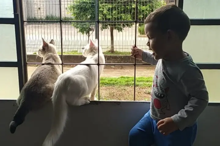 Floquinho é branco e tem olhos grandes amarelos. Já Lumena é cinza tem o rabo curto e costuma ser bem dócil.