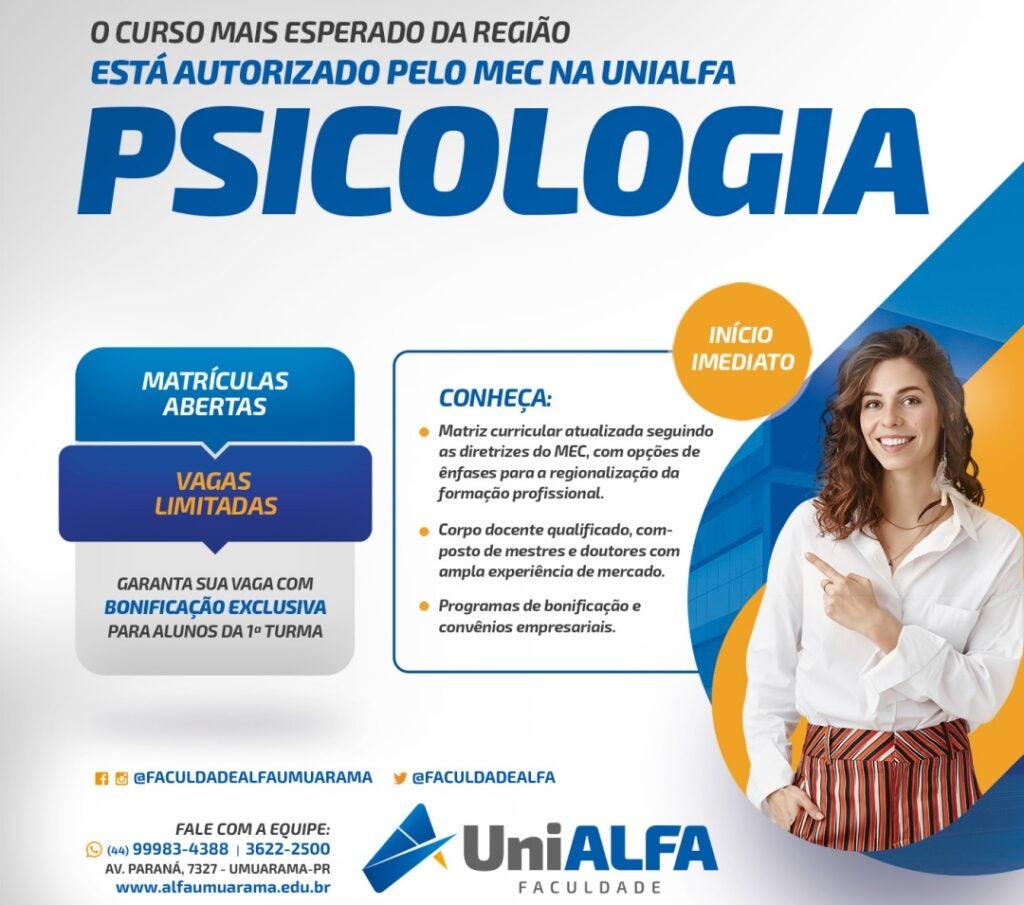 A UniAlfa Umuarama ainda em seu processo de expansão surpreende mais uma vez a comunidade local e regional. Tem início imediato o novo curso bacharelado, desta vez a Psicologia. Segundo os diretores da instituição de ensino, os candidatos já podem realizar o vestibular agendado ou utilizar nota do Exame Nacional do Ensino Médio (Enem) para concorrer às vagas.