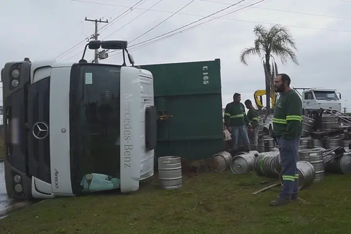 Um caminhão que transportava barris de chopp se envolveu em um acidente, na tarde desta quinta-feira (18), na rodovia PR-376, na região de Ponta Grossa. Segundo informações, o condutor perdeu o controle do veículo que veio a tombar na pista e espalhar a carga pela rodovia.