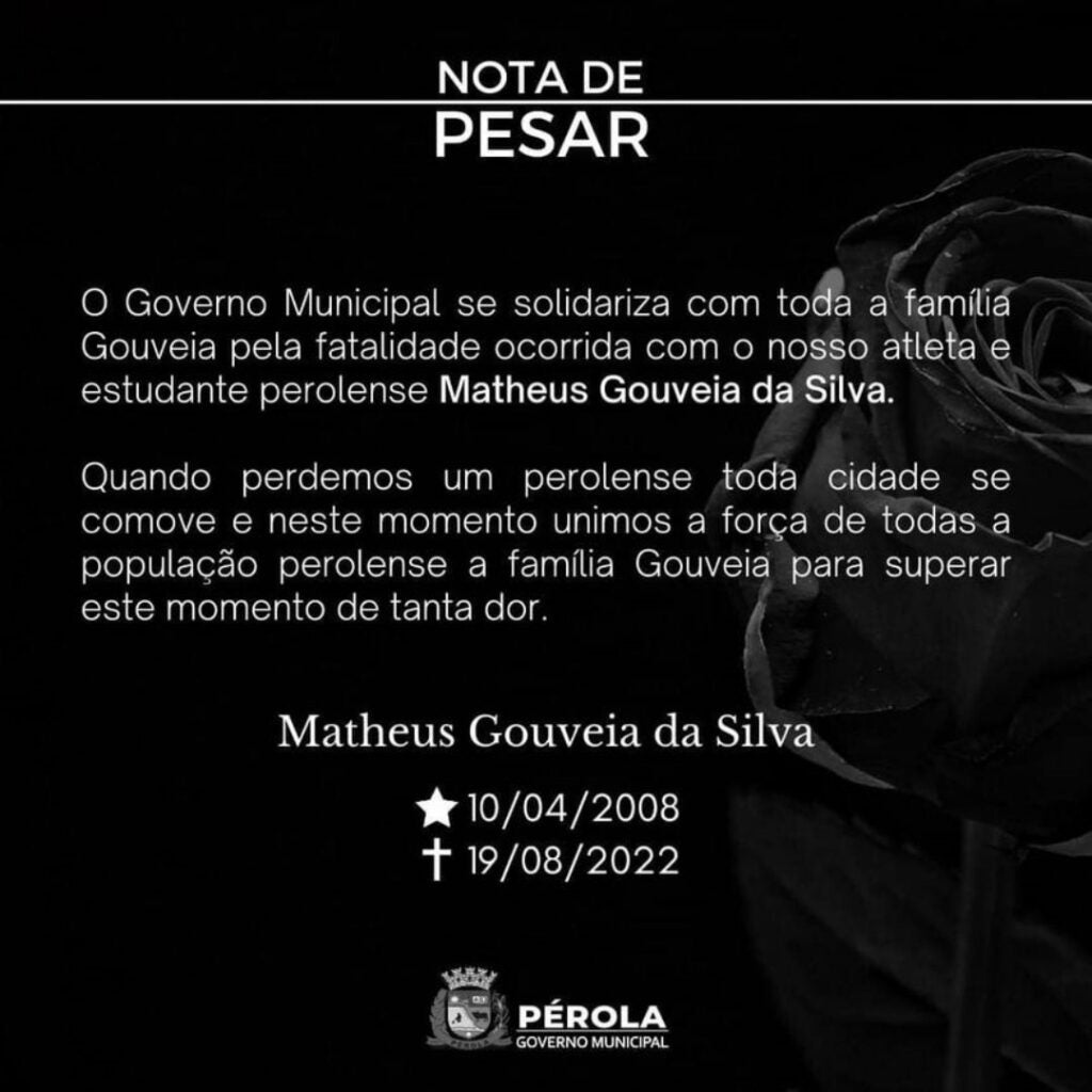 O Colégio Estadual Nestor Victor e a Prefeitura de Pérola divulgaram notas de pesar pelo falecimento do jovem Matheus Gouveia da Silva. O estudante e atleta tinha 14 anos.