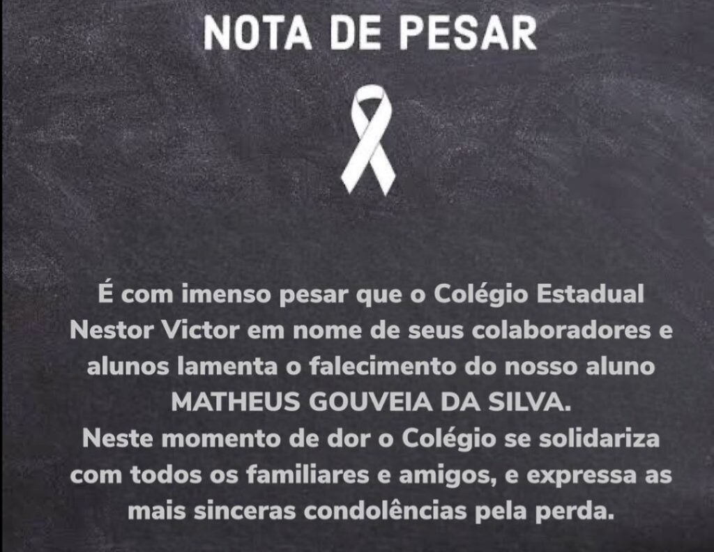 “É com imenso pesar que o Colégio Estadual Nestor Victor em nome dos seus colaboradores e alunos lamenta o falecimento do nosso aluno Matheus Gouveia da Silva. Neste momento de dor o Colégio se solidariza com todos os familiares e amigos, e expressa as mais sinceras condolências pela perda”, divulgou a direção do Colégio.