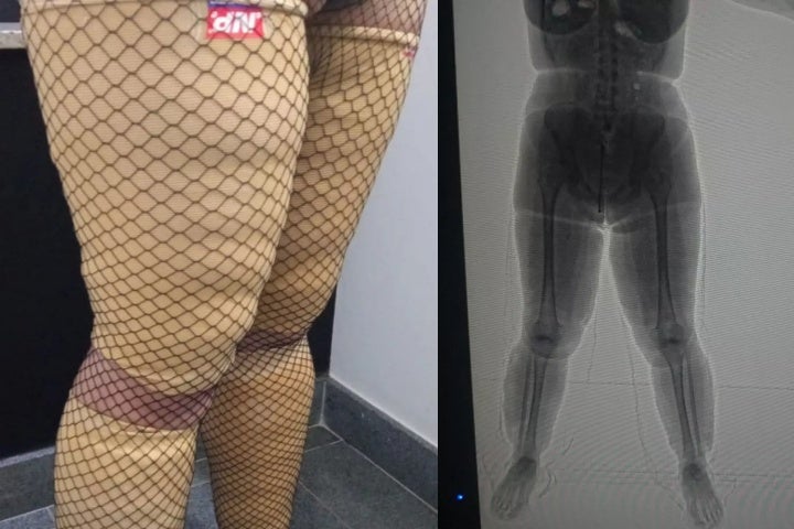 Fotos divulgadas pela corporação mostram que a droga estava presa ao corpo dela com meias de alta compressão e meia calça.