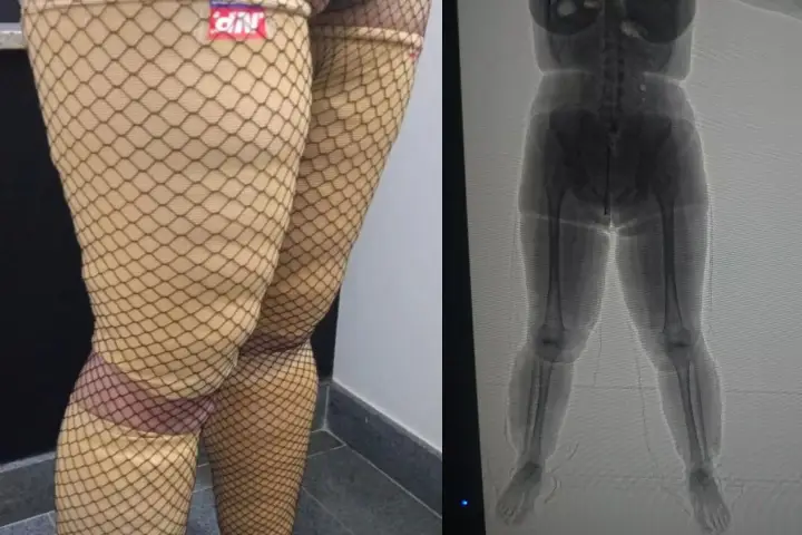 A PF afirma que, após fiscalização de rotina, a droga presa ao corpo da passageira foi identificada com ajuda de equipamento de escaneamento corporal.