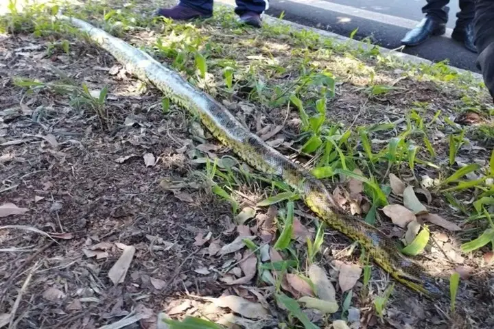 Pedestres que passaram nesta segunda-feira (22) pela avenida Arthur Thomas, em Londrina, tiveram um baita susto ao se encontrar com uma cobra sucuri filhote, de aproximadamente dois metros e meio, que estava no canteiro da estrada.