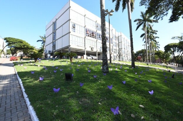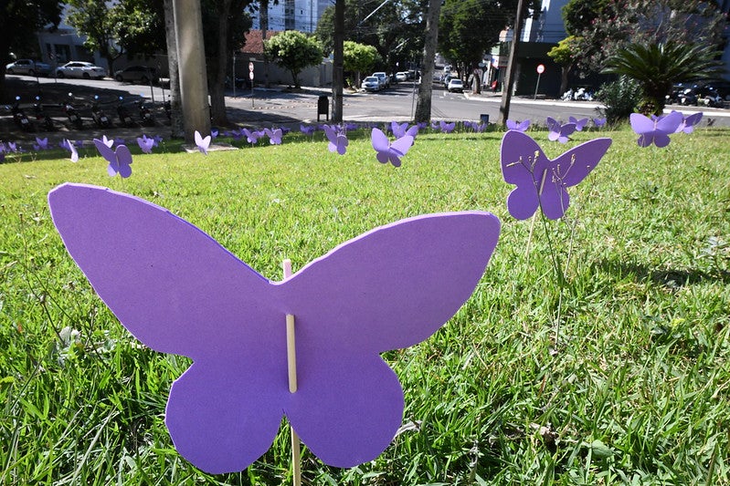 Ela comenta que centenas de borboletas feitas de EVA foram colocadas no Paço Municipal, também como forma de chamar a atenção da população para o Agosto Lilás.