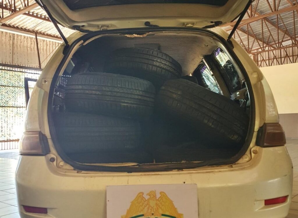 Foi abordado um veículo Toyota/Gaia, de origem paraguaia. No interior do automóvel foram encontrados 54 pneus.