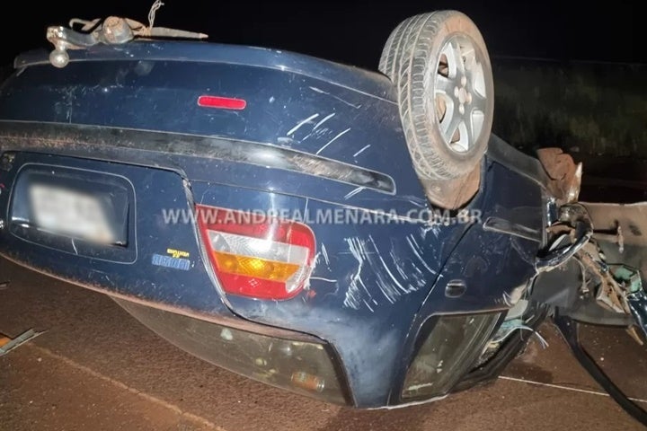 Um motorista de automóvel Fiat Siena ficou ferido após uma violenta colisão na noite desta terça-feira (30), no trecho entre Maringá e Paiçandu da rodovia PR-323. O carro, que bateu contra um poste de energia, acabou capotando e parando com as quatro rodas para cima após o acidente.