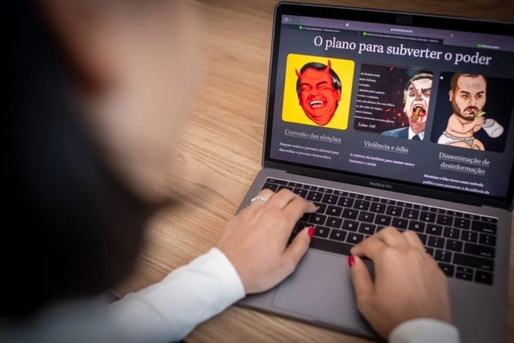 O site ainda expõe uma série de imagens e textos críticos ao presidente, com os títulos “Corrosão das eleições”, “Violência e ódio” e até o “Disseminação de desinformação” – este último sendo ilustrado pelo rosto do filho do presidente, Carlos Bolsonaro (PL), em uma caricatura onde o parlamentar aparece com a infame “mamadeira de piroca”.