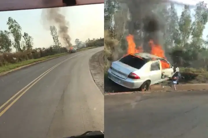 Imagens enviadas por um leitor do OBemdito mostram o incêndio resultado de um capotamento de automóvel que aconteceu na manhã desta sexta-feira (2) na rodovia Moacyr Loures Pacheco, a PR-482, município de Maria Helena.