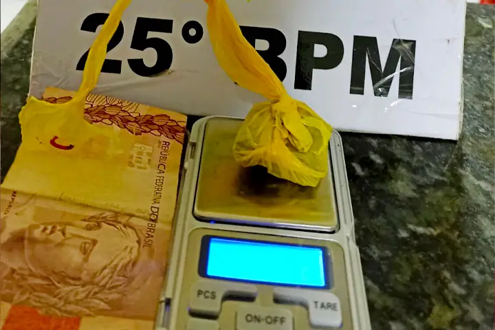 Os dois foram abordados. Com eles os PMs encontraram um tablete de maconha pesando cerca de 7 gramas, em invólucro plástico na cor amarela.