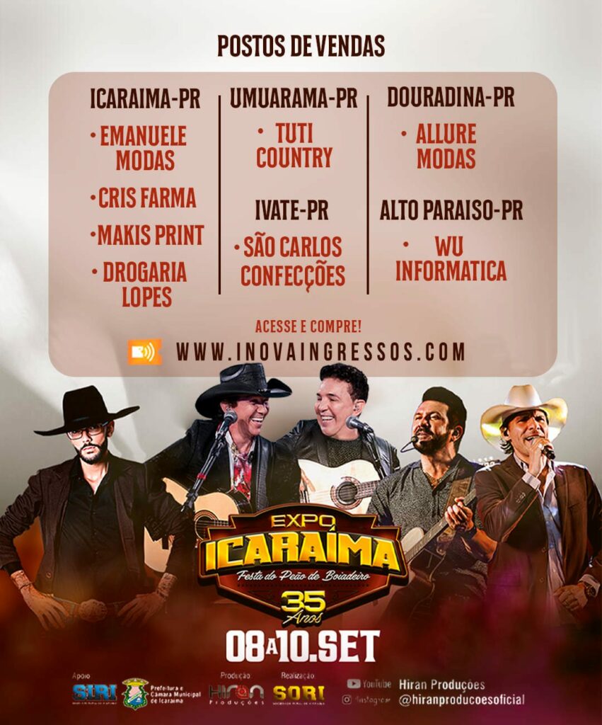 Esta é a 35ª edição da Expo Icaraíma. Luan Pereira abre a agenda de shows nesta quinta-feira. Na sexta (9) a animação fica a cargo dos veteranos Di Paulo & Paulino. Jads & Jardson fecham a programação musical no sábado (10).