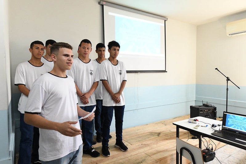 Um grupo de alunos da Guarda Mirim apresentou uma ação que está em curso na entidade e que pode ser levada pra escolas e outras instituições que trabalham com crianças e adolescentes. Eles produziram uma entrevista em vídeo com jovens que usam ou têm contato com o cigarro eletrônico, demonstraram um experimento de capacidade pulmonar com um fumante e um não fumante e também criam um jogral para conscientizar o público ouvinte.