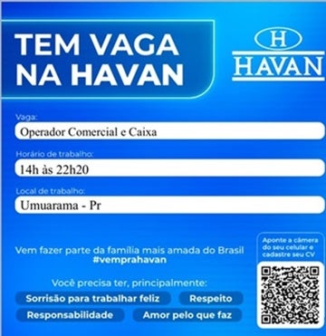 A loja Havan também divulgou que está com uma vaga aberta para o cargo de Operador Comercial e Caixa na unidade de Umuarama.