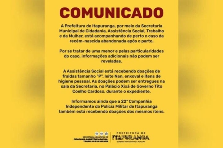 De acordo com a Polícia Militar (PM), uma moradora identificada como Ilma disse que teria ouvido um choro agudo, porém desconfiou que se tratava de um gatinho miando. Quando ela se aproximou do local, teve a surpresa ao descobrir que era uma criança que foi abandonada.