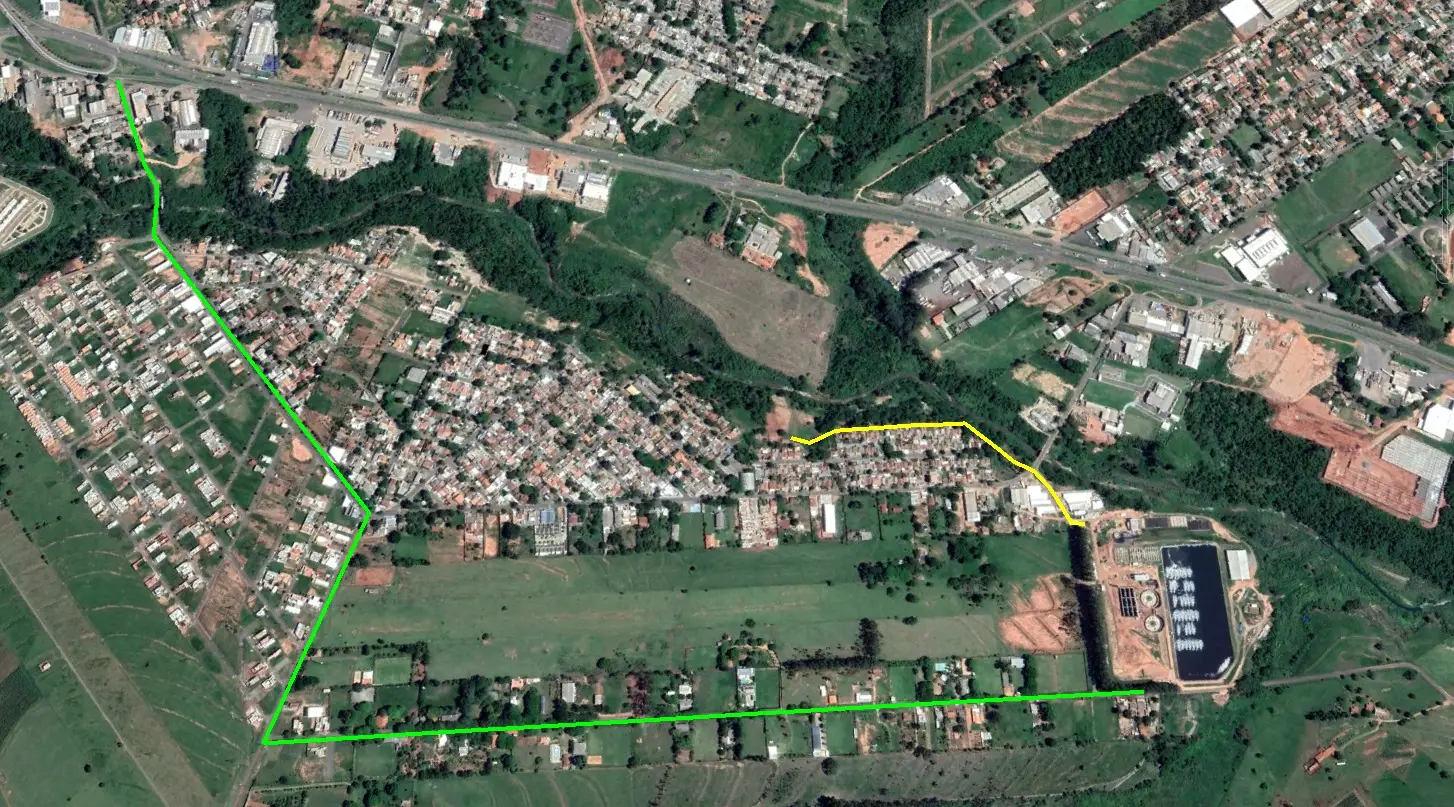 O traçado em amarelo mostra o trajeto de implantação das tubulações de esgoto. O trecho marcado em verde aponta o acesso alternativo aos bairros | Foto: Sanepar
