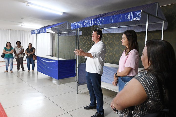As tendas medem 2 m x 1 m, têm estrutura de metal, prateleiras de madeiras e cobertura em lona plástica, identificadas com o brasão do município.