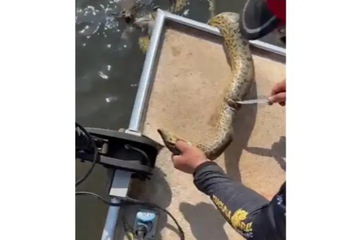 Nas imagens, um dos homens (que é guia de pesca) segura a serpente pela cabeça e corta os fios da rede. Ele tem bastante trabalho, pois o animal insiste em se mexer.