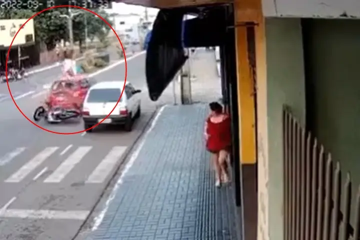 Nas imagens – assista abaixo – é possível ver que o Ford Ka segue pela avenida em baixa velocidade e em um piscar de olhos é atingido pela moto que seguia em alta velocidade. Com o impacto o condutor “voa” por cima do automóvel.