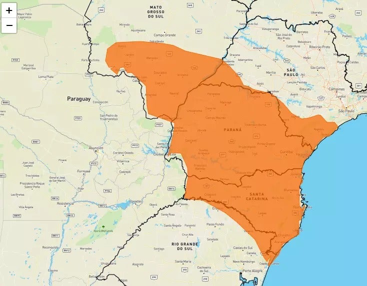 O alerta se estende por todo o Paraná, Santa Catarina e parte do Mato Grosso do Sul. Veja abaixo:
