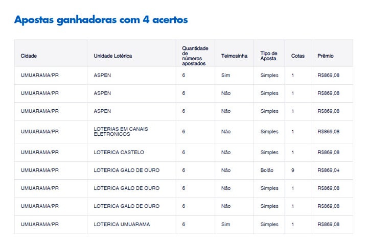 As apostas aconteceram na Lotérica Aspen (3 apostas), canais eletrônicos (1), Lotérica Castelo (1), Lotérica Galo de Ouro (3) e Lotérica Umuarama (1).